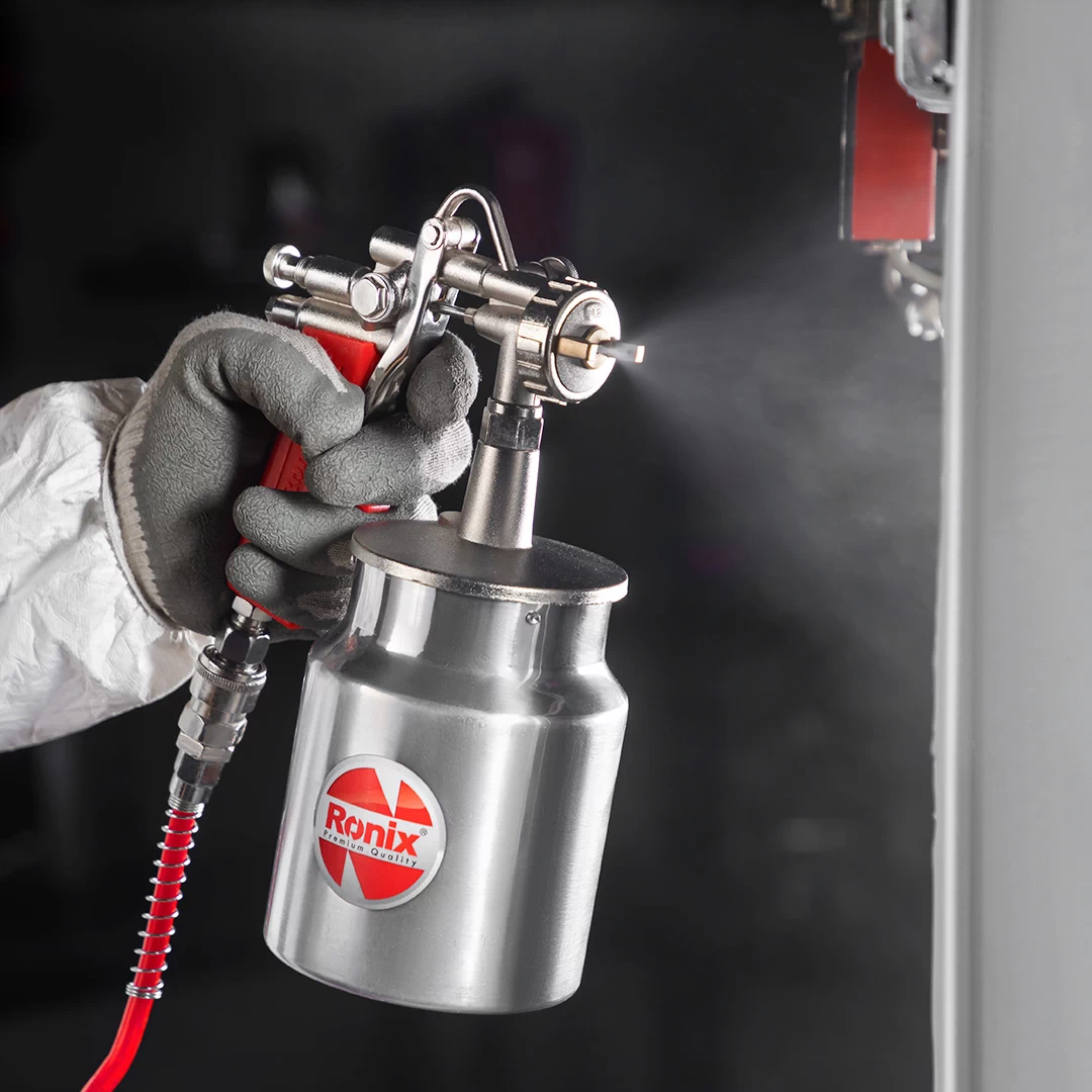 پیستوله بادی RH-6408 یک پیستوله حرفه ای برای رنگ آمیزی سطوح مختلف همانند خودرو، مبلمان، اثاثیه منزل و … است که برای پاشش رنگ های روغن یا لاتکس مناسب می باشد. نازل این پیستوله رنگ پاش به قطر 1.8 میلی متر و از جنس فولاد ضد زنگ است که مقاومت بالایی در برابر فشار و خوردگی دارد. همچنین مخزن این محصول که در قسمت پایین نازل قرار گرفته دارای ظرفیت 1000 میلی لیتر می باشد و با اتصال پیستوله به کمپرسور باد می تواند رنگ را بر روی سطوح مورد نظر بپاشد. مدل RH-6408 رونیکس از دسته ای پلاستیکی با طراحی ارگونومیک برخوردار است که راحتی فوق العاده ای را در هنگام کار ایجاد می کند.از دیگر ویژگی های این پیستوله حرفه ای قابلیت تنظیم جریان خروجی رنگ برای دستیابی به ضخامت یکنواخت رنگ است که کیفیت انجام فرآیند را افزایش می دهد. در واقع این ابزار به کاربر این امکان را می دهد که میزان پاشش را مطابق با نیاز خود تنظیم کند و نیز بدون توقف، به رنگ کاری سطوح وسیع تری بپردازد. در ضمن پیستوله بادی کاسه زیر سایز 1.8 رونیکس توان ایجاد فشار کاری بین 3.5 تا 5 بار را دارد.