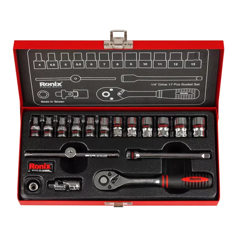 12 عدد سوکت تک 1/4 اینچ در سایزهای 4، 4.5، 5، 5.5، 6، 7، 8، 9، 10، 11، 12 و 13 میلی‌ متر