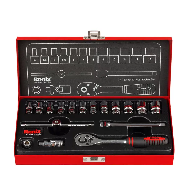 • مجموعه ‌ای دارای 17 قطعه، ساخته شده از مواد باکیفیت سخت‌ کاری شده با گشتاور بالا- دارای سوکت ‌های فولادی از جنس کروم وانادیوم با مقاومت و استحکام بالا که با کروم شفاف آینه ‌ای روکش شده ‌اند تا در برابر زنگ‌ زدگی و خوردگی مقاوم باشند- لبه‌ سوکت ‌ها در این محصول به دقت تراش خورده است که این ویژگی با ایجاد اندازه ‌های دقیق و انتهای مورب در سوکت ‌ها، قرار دادن بکس بر سطح کار را آسان نموده و از خود دستگاه و سطح کار در برابر آسیب حاصل از لبه ‌های تیز سوکت محافظت می ‌کند- سوکت ‌ها و سایر متعلقات این محصول روی دسته جغجغه قفل می ‌شوند، سپس برای دسترسی سریع کاربر به وسیله یک دکمه به آسانی آزاد می ‌شوند- طراحی ارگونومیک دسته جغجغه به کاربر امکان می ‌دهد تا هنگام در دست داشتن دسته کلید چپگرد/راستگرد را با استفاده از انگشت شست فعال کرده و نیاز به استفاده از دست دیگر نداشته باشد- سازگار با تمام آچارهای دستی و دسته جغجغه ‌‌ها- مناسب برای باز و بسته کردن مهره ‌های یخ زده یا زنگ زده با کمترین میزان لغزش- یک مجموعه کامل شامل اندازه ‌های مختلف سر بکس به علاوه یک پیچ گوشتی و یک دسته جغجغه- دارای یک کیف فلزی محکم برای حمل و نگهداری آسان مجموعه- ساخت کشور تایوان