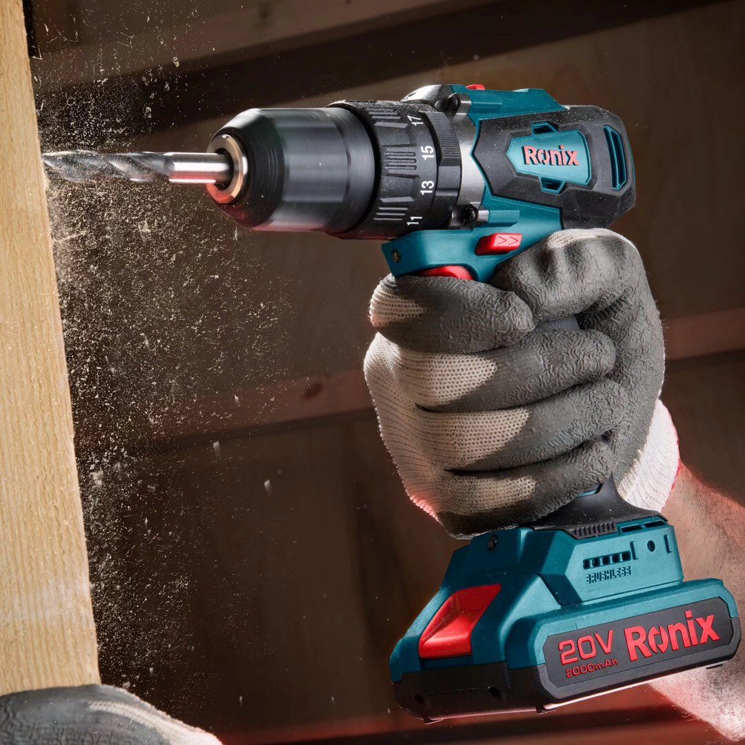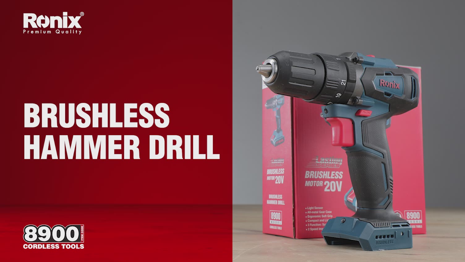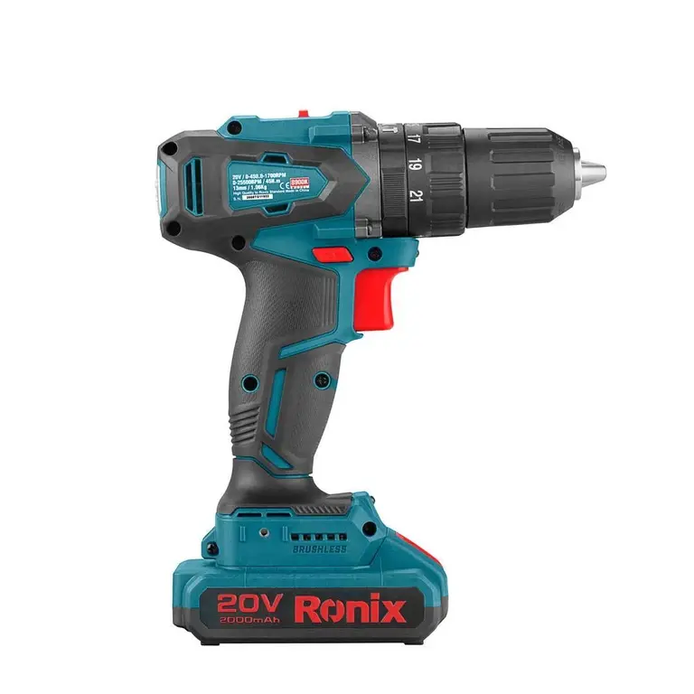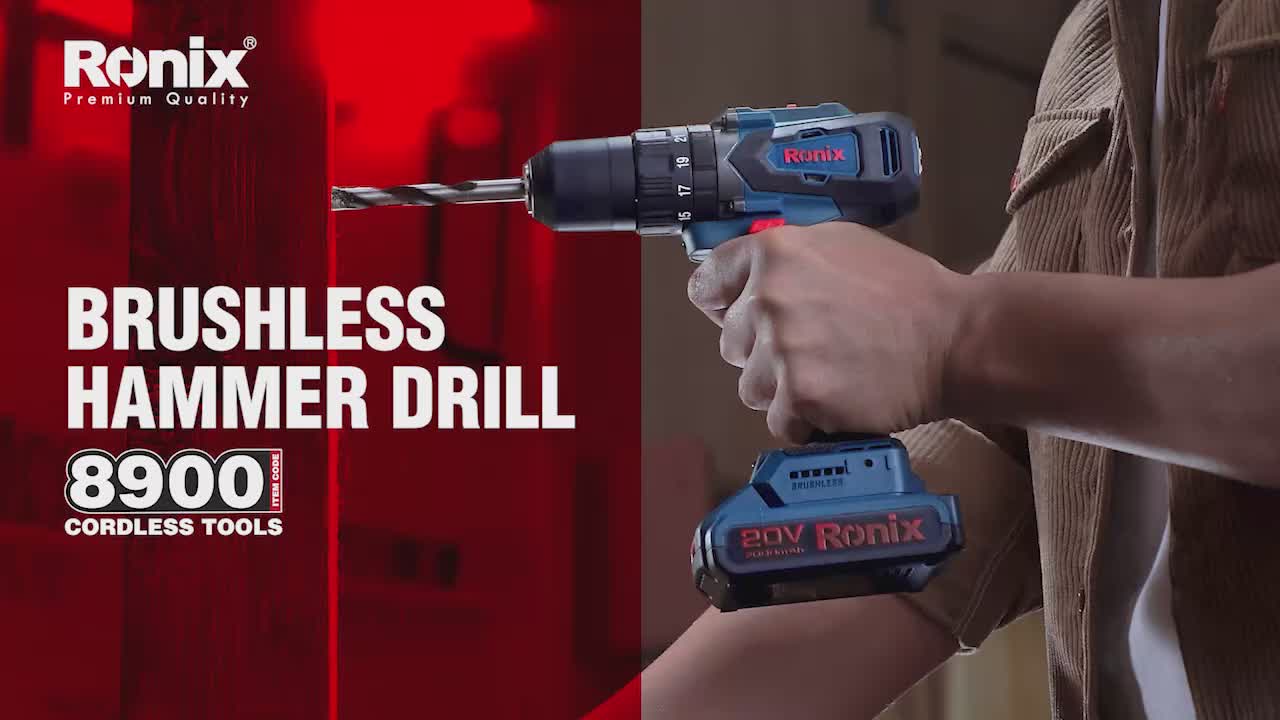 دریل پیچگوشتی چکشی شارژی 8900 رونیکس: موتور براشلس ضد آب، گیربکس دو سرعته، سه نظام اتوماتیک 13 میلیمتری