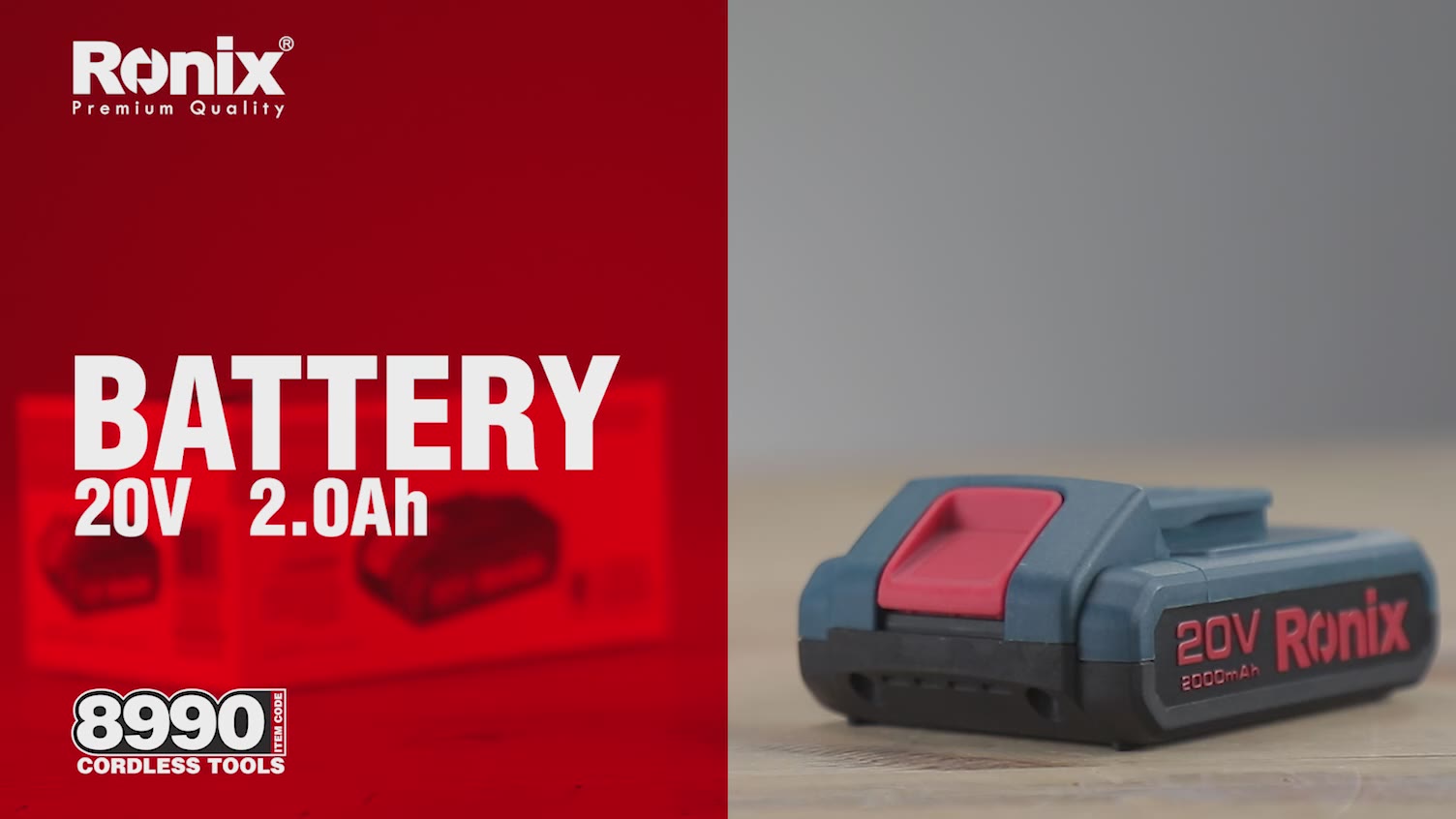 در تمام محصولات سری 89 رونیکس، از باتریهای نسل جدید لیتیوم-یون استفاده میشود. این باتریها با سهولت کاربرد، طول عمر بالا و ابعاد جمع و جور، عملکرد طولانیتری را نسبت به باتریهای استاندارد ارائه میدهند. باتری 8990 رونیکس، با ولتاژ 20 ولت و ظرفیت 2 آمپر ساعت، در طول مدت یک ساعت میتواند به صورت بیوقفه مقدار 2 آمپر جریان تولید کند.