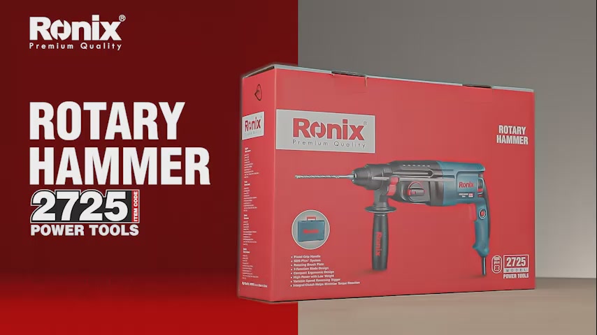 دریل بتن‌کن 2725 رونیکس، مجهز به یک موتور قدرتمند 850 وات با سرعتی بالغ بر 1200 دور در دقیقه و شامل آرمیچر و بالشتک‌‌های صنعتی است به وسیله‌ی دستگاه‌‌های تمام اتوماتیک و مطابق با استانداردهای روز دنیا تولید شده‌اند. از این دستگاه در سطوح مختلف چوبی، فلزی، بتنی و برای انجام 4 عمکلرد مجزای سوراخ‌کاری، سوراخ‌کاری چکشی، تخریب و خلاص‌کن استفاده می‌شود.