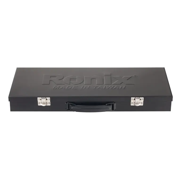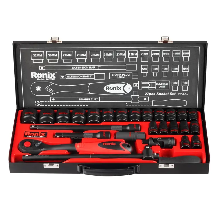 مجموعه بکس 27 عددی رونیکس مدل RH-2627 مجموعه ای دارای 27 قطعه، ساخته شده از مواد باکیفیت سخت کاری شده با گشتاور بالا می باشد. این ست دارای سوکت های فولادی از جنس کروم وانادیوم با مقاومت و استحکام بالا است که با کروم مشکی روکش شده اند تا در برابر زنگ زدگی و خوردگی مقاوم باشند. لبه سوکت ها در این محصول به دقت تراش خورده اند که این ویژگی با ایجاد اندازه های دقیق و انتهای مورب در سوکت ها، قرار دادن بکس بر سطح کار را آسان نموده و از خود دستگاه، سطح کار و پیچ ها در برابر آسیب حاصل از لبه های تیز سوکت محافظت می کند.تمامی قطعات این محصول در یک کیف فلزی محکم و مقاوم نگهداری شده و این کیف فلزی در بسته بندی طراحی شده توسط رونیکس ارائه می شود.