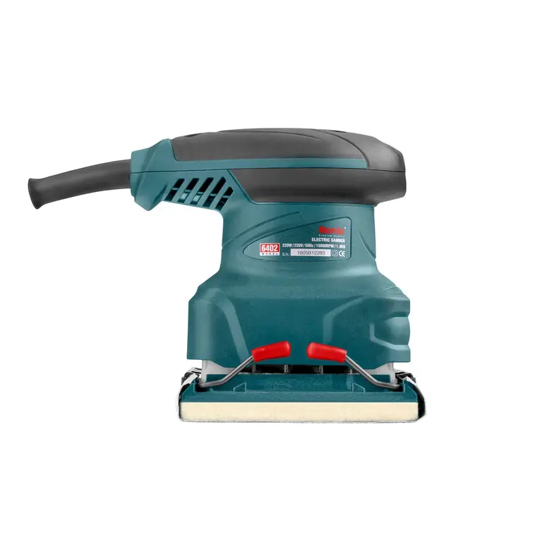 سنباده لرزان برقی 6402V دارای موتوری با توان 220 وات است که با ولتاژ 110 ولت قابلیت چرخش تا 15000 دور در دقیقه را برای دستگاه فراهم می کند. با توجه به اینکه این دستگاه در کارگاه های نجاری کاربرد دارد، در طراحی آن از بلبرینگ ها و کلید ضد غبار استفاده شده است تا با جلوگیری از ورود گرد و غبار و تراشه های چوب به داخل دستگاه موجب افزایش طول عمر آن شود.از دیگر ویژگی های سنباده لرزان 220 وات مدل 6402V بدنه کوچک و وزن سبک آن است که امکان استفاده با یک دست را برای کاربر فراهم می کند؛ از این جهت 6402V به سنباده لرزان مشتی نیز معروف است. در کنار این ویژگی ها برای دستگاه 6402V یک دسته ارگونومیک تعبیه شده که باعث کاهش لرزش و در نتیجه افزایش کنترل روی فرایند کاری می شود. این ابزار برقی به سیستم جدید و پیشرفته ای مجهز شده تا به راحتی بتوان صفحه سنباده را به کفی آلومینیوم متصل کرد. این دستگاه مجهز به سیستم قفل کن بوده که این سیستم با ثابت نگه داشتن دستگاه در حالت روشن روشن سهولت را برای کاربران به ارمغان می­آورد و به آنان اجازه می ­دهد در فعالیت­ های طولانی مدت با خاطری آسوده و به طور پیوسته از دستگاه خود استفاده کنند. در ضمن در بسته بندی این محصول یک صفحه سنباده، پد اسفنجی و پایه آویز قرار داده شده است.