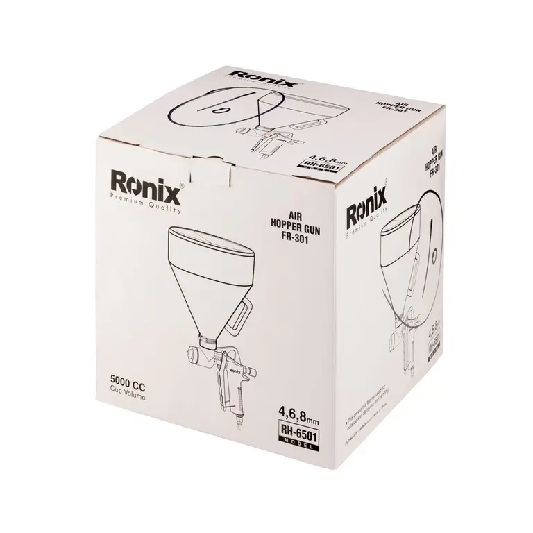 پیستوله کنیتکس پاش ابزاری مناسب برای پاشش کنیتکس جهت نقاشی دیوارهای خارجی ساختمان، کارگاه و … می باشد که برای استفاده از این دستگاه نیاز به کمپرسور باد است. مدل RH-6501 رونیکس دارای کاسه ای در قسمت بالا و از جنس پلاستیک بوده که ظرفیت آن برابر با 5000 سی سی می باشد. بدنه این ابزار بادی ساخته شده از فلز به همراه نازل فولادی ضد زنگ و پوشش مسی است که باعث دوام بالا و طول عمر بیشتر این کنیتکس پاش می شود.از دیگر ویژگی های پیستوله کنیتکس پاش بادی رونیکس برخورداری از سه نازل در سایزهای 4، 6 و 8 میلی متر است که میزان تسلط بر نحوه پاشش مایعات را افزایش می دهد و استفاده از این ابزار را در شرایط مختلف امکان پذیر می کند. وزن سبک و ساختار ارگونومیک مدل RH-6501 رونیکس اجازه می دهد که کاربر تا ساعت ها بتواند بدون خستگی به فعالیت خود ادامه دهد. همچنین دسته جانبی ارگونومیک و ضد لغزش نگه داشتن این ابزار را آسان تر می کند و این امکان را به کاربر می دهد که با اطمینان از کنیتکس پاش استفاده کند.