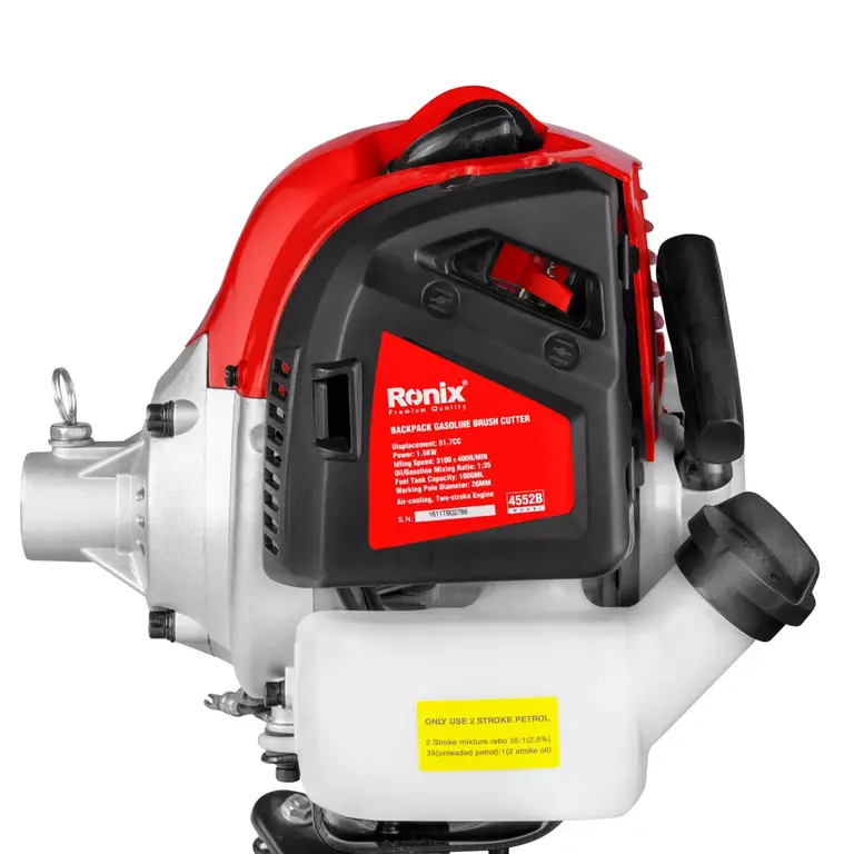 دارای کولهپشتی ارگونومیک برای سهولت حمل ابزار؛ ارائهشده در جعبه طراحیشده رونیکس همراه با تیغه فلزی سهپره، سر برش نایلونی، محافظ، مهار شانه، بطری اختلاط روغن و بنزین، آچار آلن