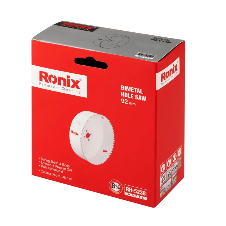 مته گردبر بایمتال مدل RH-5238 رونیکس قطعه ای مناسب برای برش های صاف و دقیق می باشد. این ابزار قابلیت نصب بر روی انواع دریل های ستونی، رادیال و … را داشته و در اندازه 92 میلی متر تولید شده است. لبه های گردبر بایمتال RH-5238 با بالاترین کیفیت و فناوری ساخته شده که افزایش دوام و بهبود عملکرد را به همراه دارد.بدنه این قطعه ساخته شده از جنس کبالت %8 و فولاد تیزبر HSS است که باعث حداکثر کارایی و ایجاد برش هایی دقیق و سریع تا عمق 38 میلی متر در قطعه کار می شود. از دیگر ویژگی های این گردبر قابلیت استفاده آن در مواد مختلف فلزی و آلیاژی با درجه سختی مختلف می باشد. در ضمن این ابزار در جعبه طراحی شده توسط رونیکس عرضه می شود.