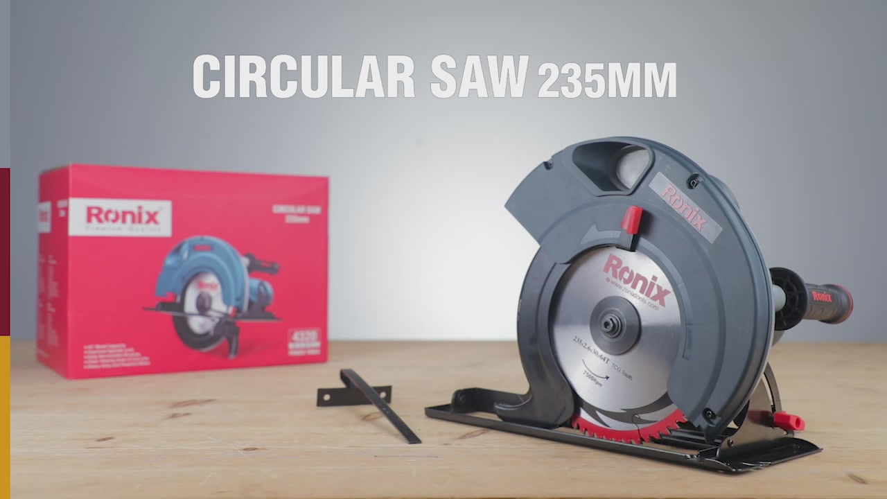 ارائهشده در جعبه رنگی رونیکس همراه با گونیا، دسته جانبی، دو رینگ تیغه، آچار آلن، تیغه 235×2.4×30 میلیمتری 56T