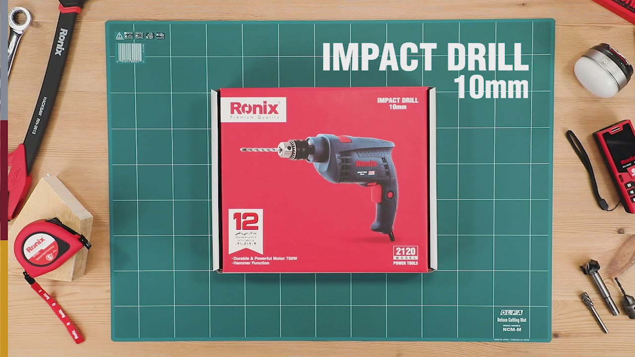 دریل 10 میلی‌متر چکشی 750 وات 2120 در جعبۀ رنگی رونیکس و همراه با یک آچار سه‌نظام به بازار عرضه شده است.