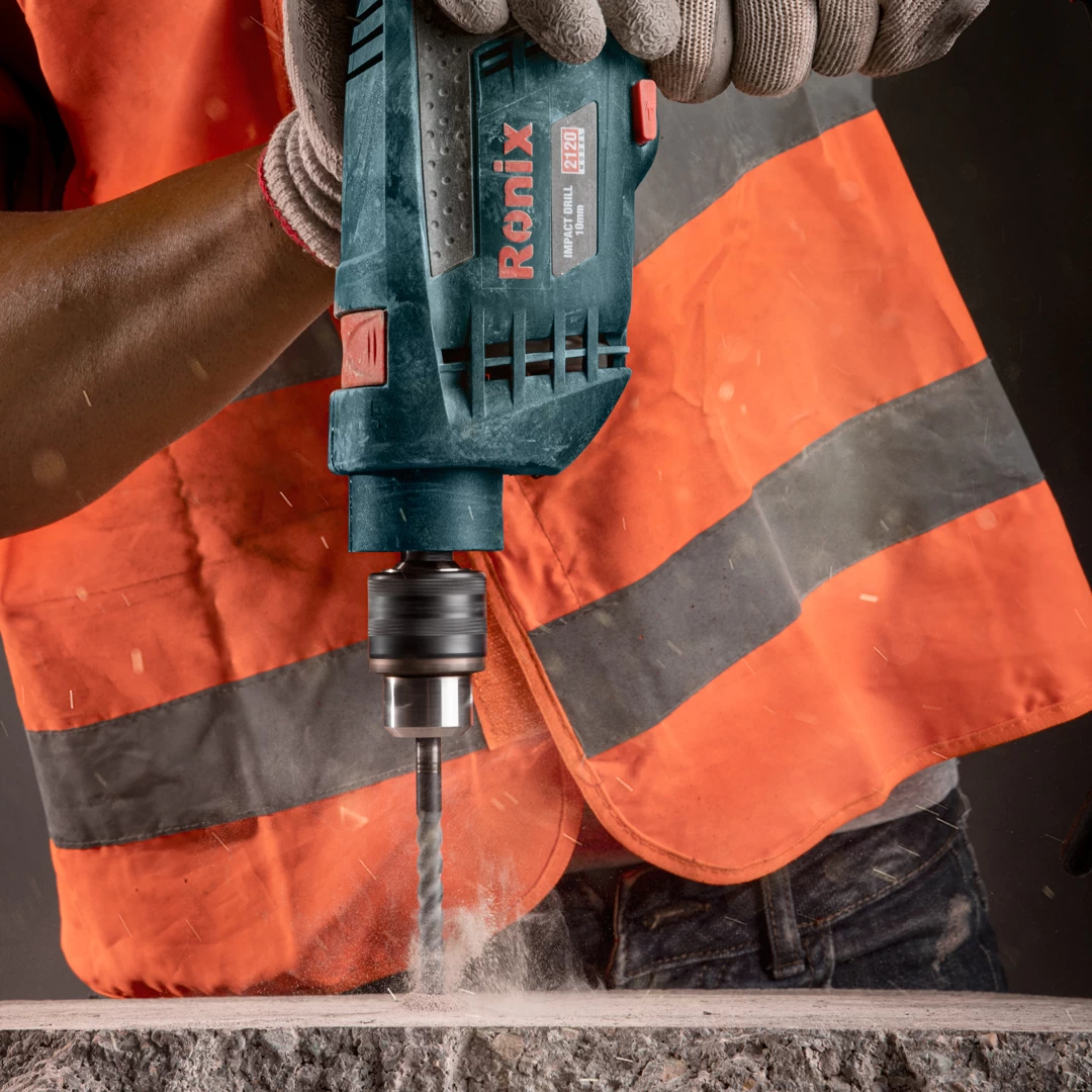 دریل چکشی 2120 رونیکس، با موتور قدرتمند 750 وات کار می‌کند که مجهز به آرمیچر و بالشتک‌های صنعتی است. این قطعات مطابق آخرین استانداردهای روز دنیا ساخته شده‌اند. این دریل، با ترکیب دو نیروی چرخشی و ضربه‌ای، سوراخ‌کاری معمولی و سوراخ‌کاری چکشی را در سطوح بسیار سخت مانند انواع دیوار به آسانی انجام می‌دهد. حداکثر سرعت گردش در این دریل چکشی پرقدرت 2800 دور بر دقیقه است که به وسیله‌ کلید الکترونیک دیمردار تنظیم می‌شود.