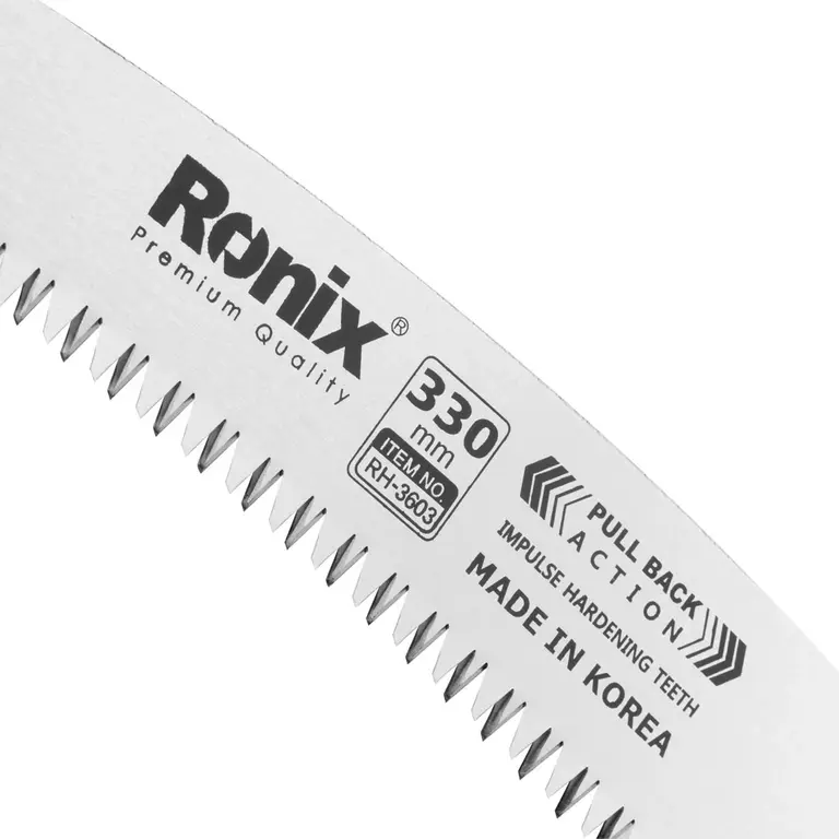 هنگام خرید یک اره باغبانی حتما باید به ویژگی‌های تیغه آن توجهی ویژه داشت. تیغه اره باغبانی RH-3603 رونیکس از جنس فولادِ کربن بالای SK-5 است. تیغه‌ای با دندانه‌های سه پهلو برای افزایش کارایی و همچنین برش‌های آسان‌تر.