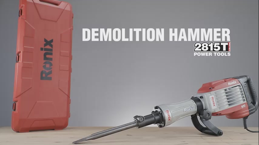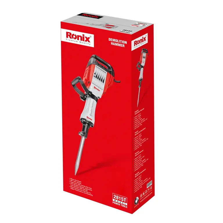 چکش تخریب 15 کیلویی 2815T از سری تاپ لاین رونیکس، مجهز به موتور قدرتمند 1500 وات است که از آرمیچر و بالشتک صنعتی تشکیل شده و تعداد ضربات آن در حالت آزاد برابر با 1400 ضربه در دقیقه است. این دستگاه، تحت استانداردهای EMC و GS و CE تولید شده است. توان ضربهی بالغ بر 50 ژول، نفوذ مته در بتن و سایر سطوح متراکم را برای این چکش تخریب امکانپذیر میکند. قدرت تخریب در این محصول پرقدرت و فوق صنعتی رونیکس، به واسطهی وجود این موتور به بالاترین حد خود رسیده و باعث میشود این چکش تخریب، در عملیات تخریب بتن، آجر، سیمان و آسفالت مورد استفاده قرار بگیرد.