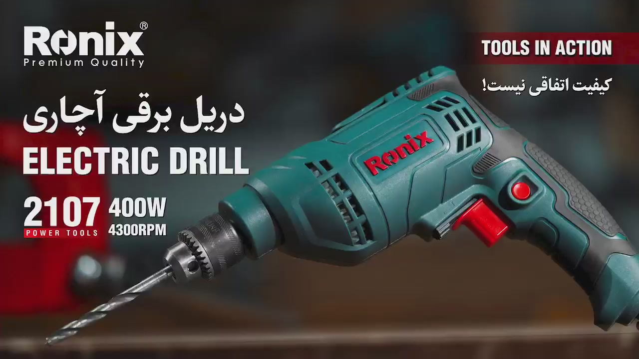 دریل برقی 6,5 میلی‌متری آچاری 400 وات 4300 دور مدل 2107 رونیکس با موتور قدرتمند 400 وات قادر است سرعتی معادل با 4300 دور بر دقیقه ایجاد کند که آن را ابزاری مناسب و کارآمد برای سوراخ‌کاری و پیچ‌کاری کرده است. سه‌نظام 6,5 میلی‌متری و آچاری این دریل قادر است مته‌های مخصوص سوراخ‌کاری روی سطوح چوبی و فلزی را در خود نگه دارد.