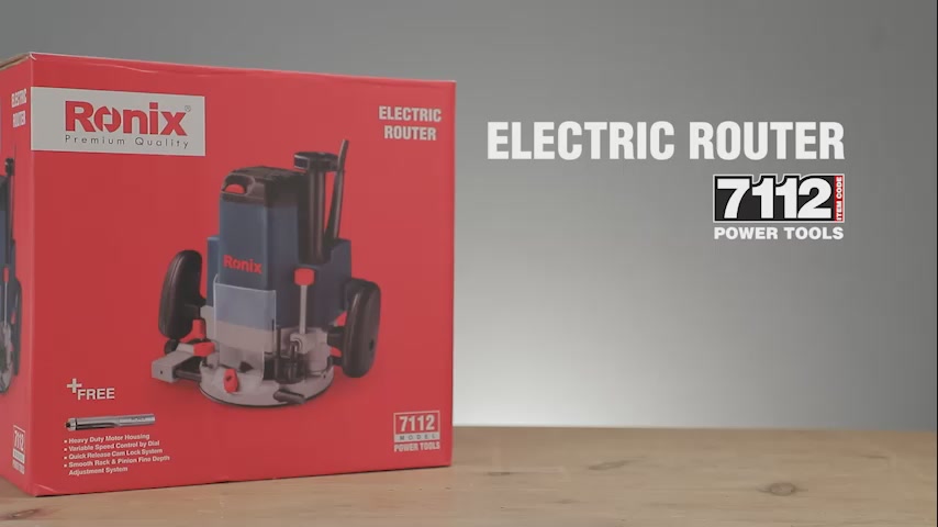 اور فرز برقی نجاری مدل 7112V قابلیت تنظیم ارتفاع و عمق برش را در سه سطح متفاوت به شما می دهد. این کار به وسیله دو محور عمودی در راست و چپ دستگاه انجام می شود. کولت (ابزارگیر) این دستگاه تقریبا سازگار با همه انواع تیغه ها از 6 میلی متر، 8 میلی متر و 12 میلی متر است و می توان گفت که شما با داشتن 7112V تقریبا قابلیت چند اور فرز برای طیف های مختلف کاری را یکجا خواهید داشت. این اورفرز برقی با تنها 6 کیلوگرم وزن و طراحی ارگونومیک بدنه، در بین خوش دست ترین ابزارآلات هم رده خود جای گرفته است. ساختار آلومینیومی بدنه 7112V همچنین دوام و عمر طولانی این دستگاه را موجب می شود. دستگیره های طرفین دستگاه نیز دارای روکش لاستیکی نرم هستند که خیال کاربر را از بابت خستگی دست در کار طولانی مدت راحت می کند. در ضمن این دستگاه در جعبه طراحی شده توسط رونیکس و به همراه متعلقاتی چون آچار آلنی، تیغه پرداخت الماسه، گونیای راهنمای برش، شابلون برش و پایه جانبی ارائه می شود.