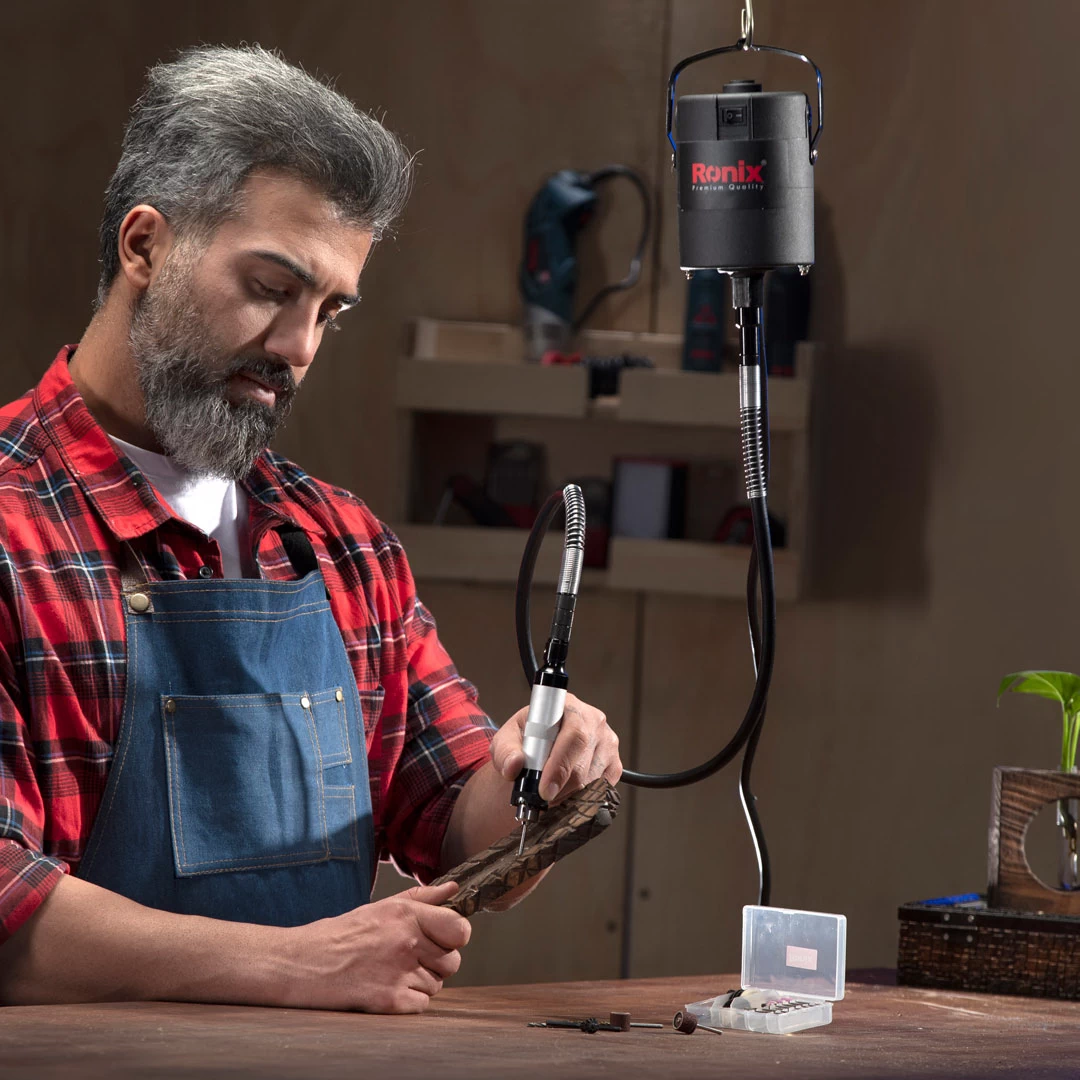 شلنگ سه ‌نظام‌دار فرز مینیاتوری 3451 رونیکس باعث می‌شود تا بتوانید با آن مانند قلم کار کرده و سطوح مختلف را حکاکی کنید. هم‌چنین، می‌توانید با پدال پایی به راحتی سرعت ابزار را کنترل کرده و آن را خاموش و روشن کنید. به این ترتیب، با دستان آزاد تسلط بیشتری روی قطعه‌ی کار خواهید داشت. قلاب فرز مینیاتوری پدالی سه ‌نظام‌دار 3451 رونیکس، قابل نصب روی دیوار و سقف است و کار را برای کاربران آسان‌تر می‌کند. در ادامه، با این محصول پرکاربرد رونیکس بیشتر آشنا شوید.