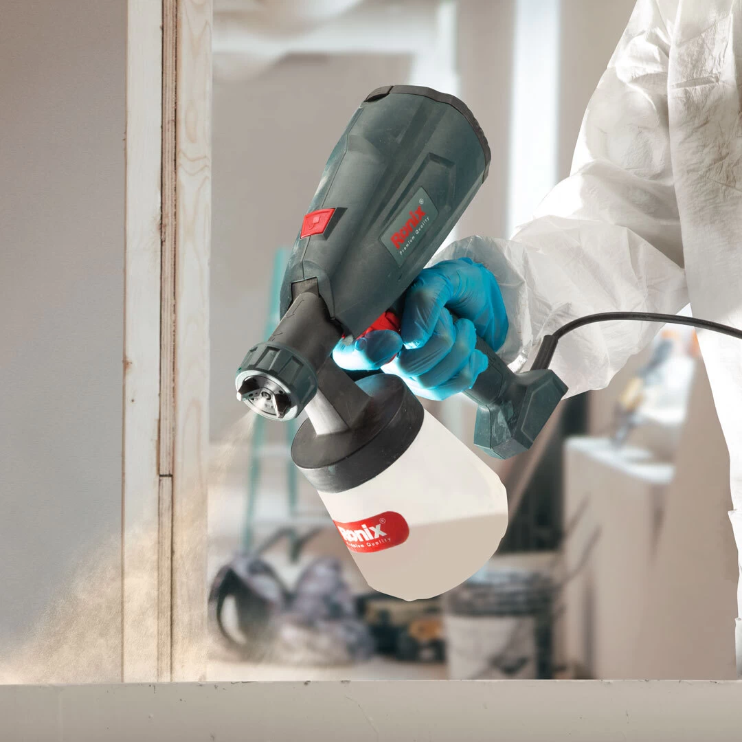 پیستوله برقی 350 وات رونیکس تحت عنوان کد محصول  1335V، دارای موتور قدرتمندی با توان 350 وات و سیستم رنگ پاشی HVLP مطابق با استاندارد CE اروپاست.این پیستوله کوچک که با ابعاد 26×27×11سانتی‎متری و وزنی معادل 2000 گرم عرضه می شود، یک پیستوله دستی قدرتمند و پیشرفته محسوب می شود.این پیستوله برقی با طراحی ویژه‌ نازل در بخش خروجی و استفاده از دو نازل با قطر های 1.8 میلی متر و 2.6 میلی ‌متر، قابلیت پاشش به سه شکل عمودی، افقی و نقطه‌ ای را به کاربران می ‌دهد.به علاوه جای‌گذاری دیمر تنظیم حجم پاشش بر روی سوییچ روشن و خاموش، امکان پاشش با حجم و فشارهای متفاوت  و متناسب با نیازتان را برای شما فراهم می کند.وجود کلید قفل برای جدا سازی و اتصال سریع و آسان قسمت تفنگی از بدنه نیز به شما کمک می‌کند تا تمیز کاری دستگاه را در کم‌ترین زمان و به بهترین شکل انجام دهید. پیستوله برقی 1335V رونیکس می‌ تواند دبی خروجی تا میزان حداکثر 700 میلی‌ لیتر در دقیقه را برای مایعات با حداکثر ویسکوزیته 60din/sec  تولید کند. وجود کاپ ویسکوزیته، امکان تنظیم میزان گرانروی مایعات مورد استفاده را به شما می‌دهد.فیلتر هوای پیستوله برقی 350 وات رونیکس، به راحتی و سریع تعویض می‌شود. لازم به ذکر است که تعویض به موقع فیلتر هوا در پیستوله برقی رنگ پاش رونیکس، در سلامت دستگاه تاثیر بسزایی داشته و به افزایش طول عمر محصول کمک خواهد کرد.