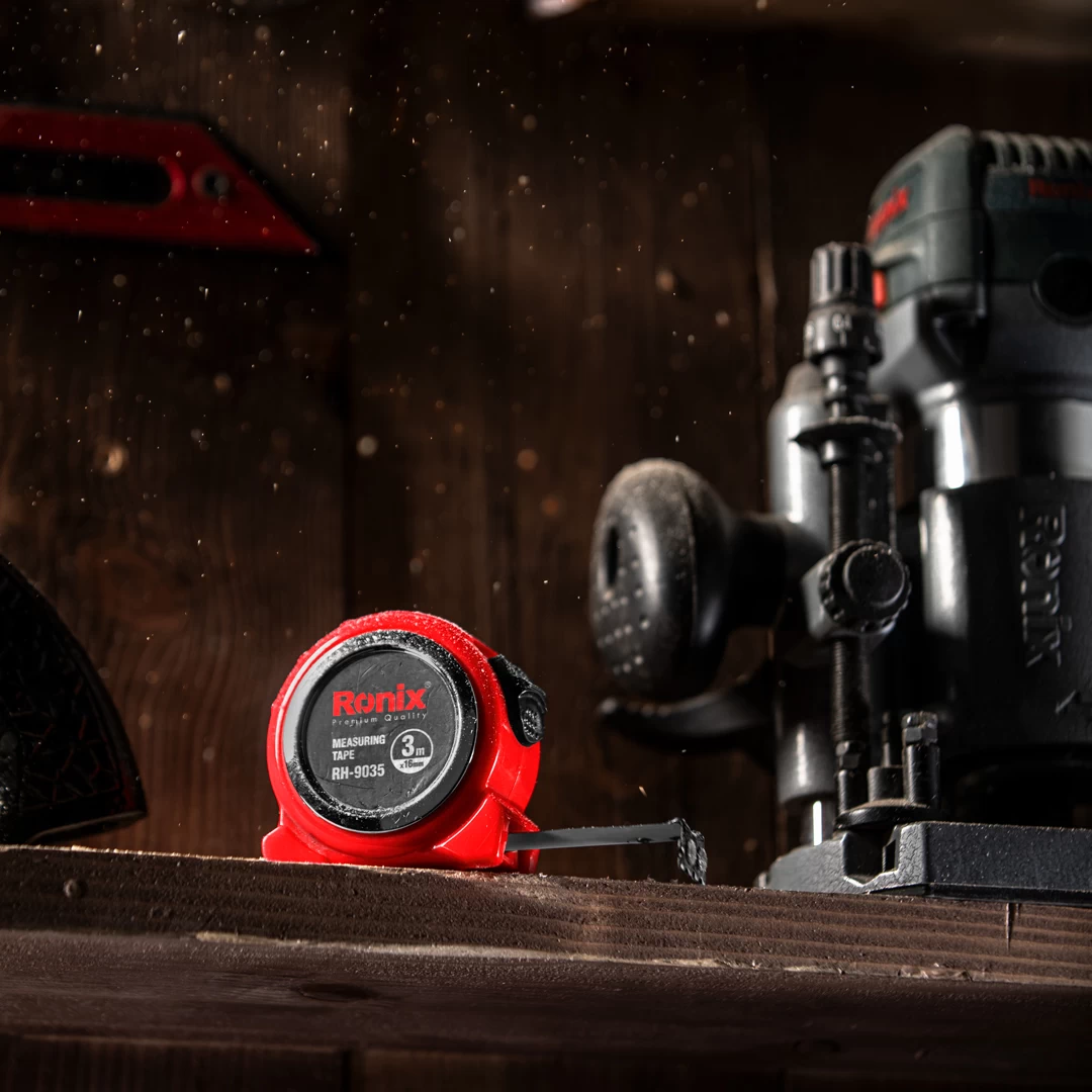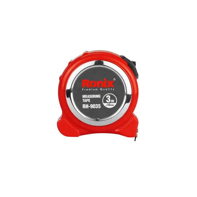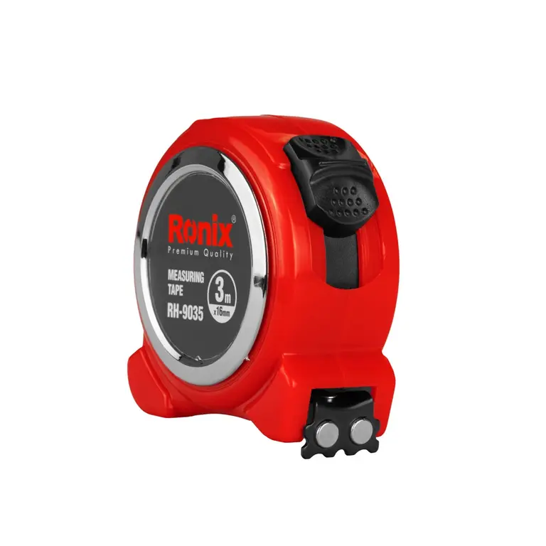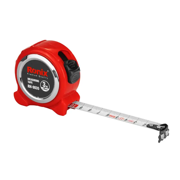 تیغه متر بدون روکش 3 متری RH-9035 رونیکس از فلزی مقاوم، با کیفیت و ضد زنگ ساخته شده که به سختی خم می شود. این تیغه 16 میلی متر عرض دارد و ضخامت آن تقریبا 1.3میلی متر است.از ویژگی های مهم این متر، تیغه آن است که در متراژهای طولانی صاف و ثابت می ایستد و حالت ایستاده خود را از دست نخواهد داد. جنس این تیغه به صورتی است به آن حالتی مات داده تا میزان تابش نور را از سطح آن به حداقل برسد؛ به این شکل خواندن متر در شرایط و محیط های مختلف بسیار راحت تر می شود.سیستم اندازه گیری این متر 3 متری بسیار دقیق و به صورت متریک است. کلیه نشانه های درج شده بر روی تیغه این محصول بسیار واضح و درشت هستند تا از فاصله دور هم قابل مشاهده باشند. از سوی دیگر هر 10 سانتی متر از طول این تیغه، با رنگ قرمز متمایز شده تا اندازه گیری هر چه آسان تر انجام شود.قسمت نوک تیغه این متر از فولاد ساخته شده و خاصیت مگنتی یا مغناطیسی بسیار قوی ای دارد. داشتن دو آهنربا در این قلاب باعث می شود قلاب به راحتی به کار بچسبد و کار اندازه گیری را آسان تر کند. این مزیت در فاصله های طولانی، یعنی در مواقعی که بین کاربر و سطح کار مسافت زیادی وجود دارد، بیشتر کاربرد خواهد داشت.